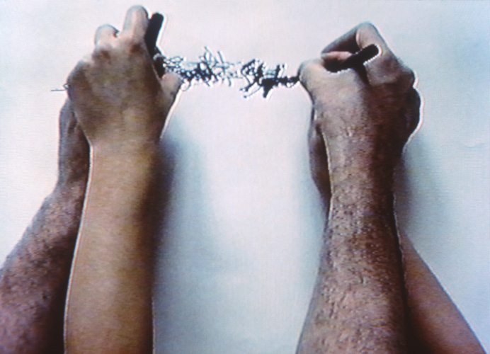 A couple, one left, one right-handed, simultaneously guide each other's non-writing hand to write their name. This becomes a physical struggle.